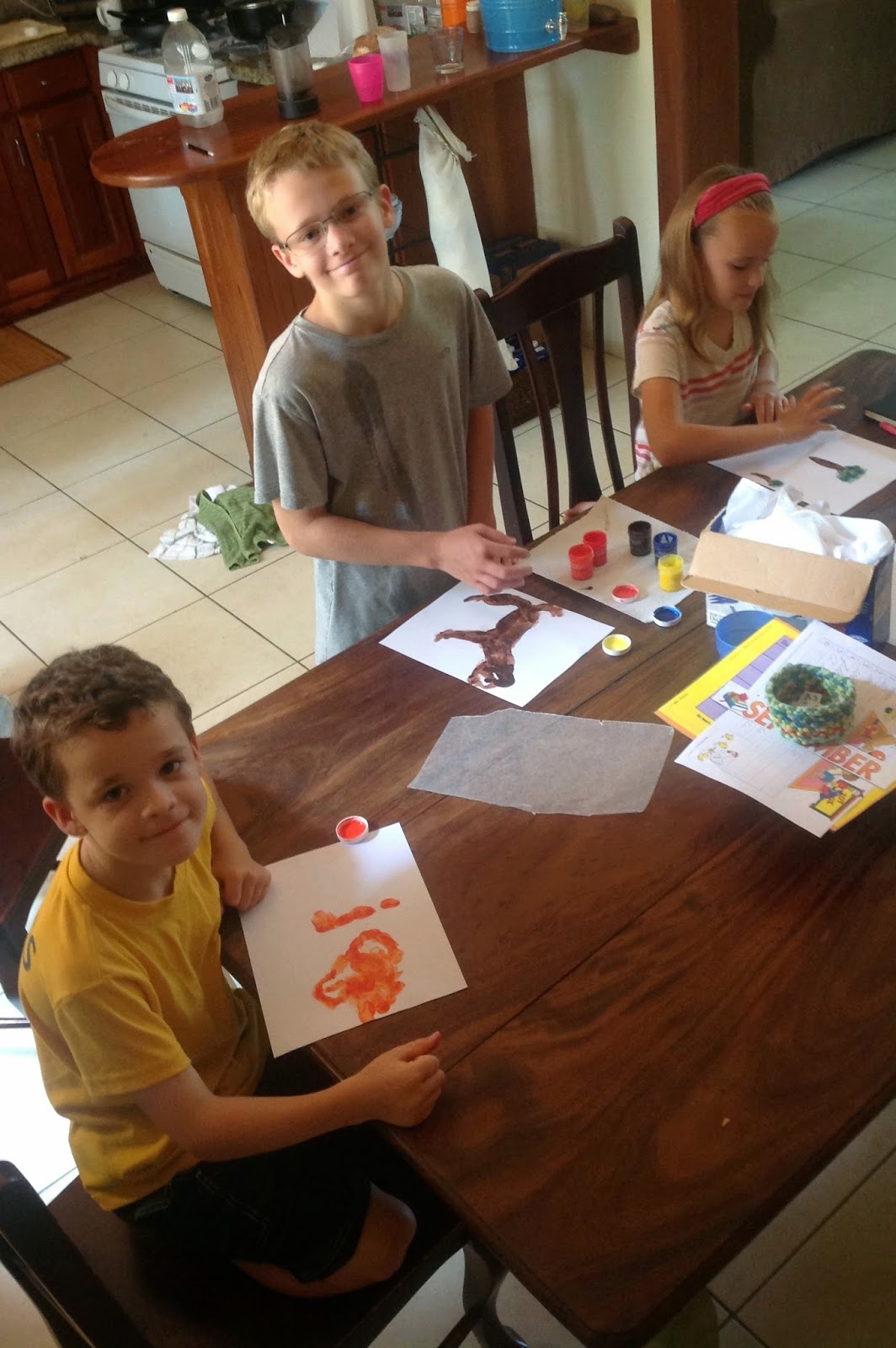 Anyway, we eventually rallied. Some learning and a lot of character building happened. We concluded the day with a rather simple activity. Finger-painting. Yes, I realize that I have a seventh grader, fourth grader and first grader. However, we just finished a family read-aloud called The One and Only Ivan.